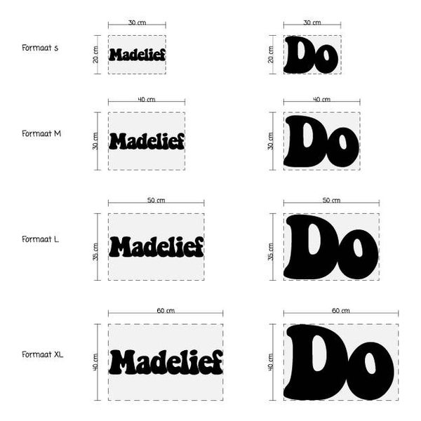 | De naam wordt gemaakt van 5 mm dik hout. Dit ligt aan hoe groot de naam gaat worden. Formaat S is max 30 cm breed, of 20 cm hoog. Formaat M wordt max 40 cm breed, of 30 cm hoog. Formaat L is max 50 cm breed, of 35 cm hoog. Formaat XL is max 60 cm breed of max 40cm hoog. Formaat XXL is max 65 cm breed of max 40cm hoog. Wij zorgen ervoor dat alle letters elkaar raken, hierdoor blijft de naam één geheel tijdens het ophangen. De naam kan opgehangen worden door middel van een klein schroefje of spijkertje. |