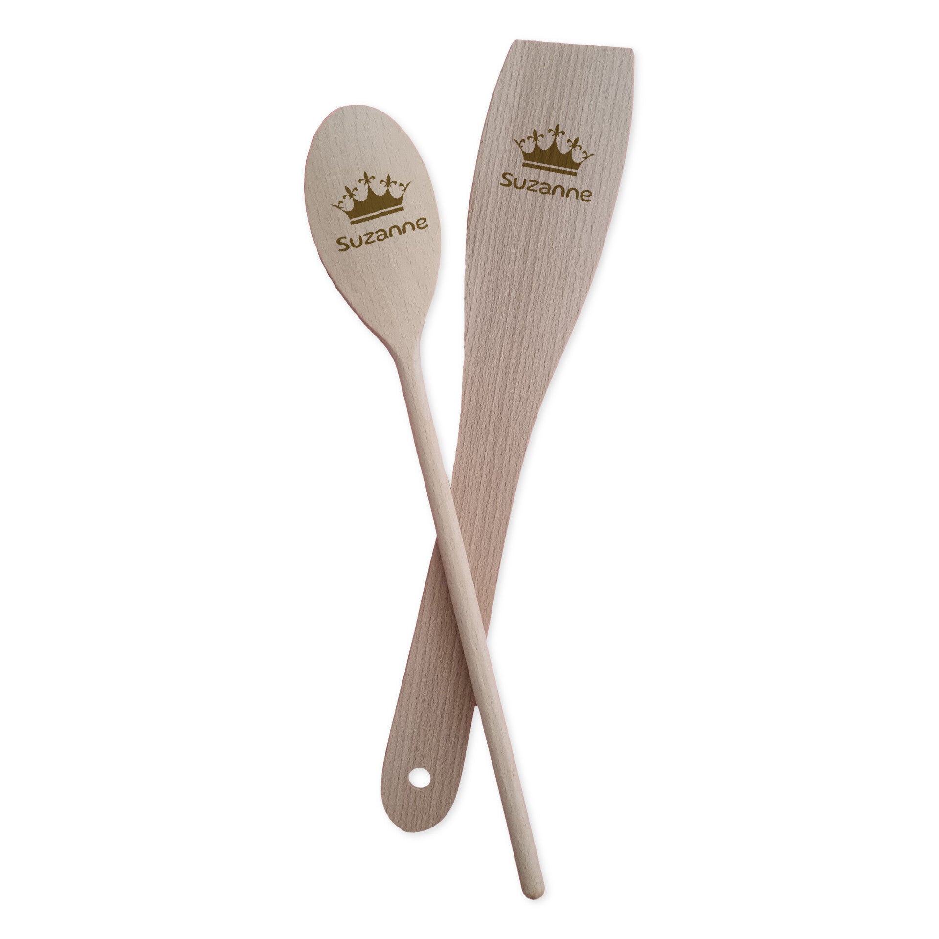 | Breng een vleugje elegantie en persoonlijkheid naar je keuken met onze bamboe pollepel/spatel set! Deze set bestaat uit een spatel en een pollepel, beide vervaardigd van hoogwaardig bamboe. Het bijzondere aan deze set is dat je een naam naar keuze kunt laten graveren onder een prachtige kroon, en het lettertype helemaal naar jouw wens kunt kiezen. Of je nu kiest voor een klassiek lettertype of een meer speelse variant, deze gepersonaliseerde pollepel/spatel set voegt een uniek en persoonlijk accent toe aan je keukengerei. Het bamboe materiaal zorgt niet alleen voor een natuurlijke uitstraling, maar is ook milieuvriendelijk en gemakkelijk schoon te maken. Of je nu op zoek bent naar een bijzonder cadeau voor een kookliefhebber of je eigen keuken wilt opfleuren, deze set is een prachtige keuze. Met de gegraveerde naam onder de kroon wordt deze set een blijvende herinnering aan speciale momenten in de keuken. |