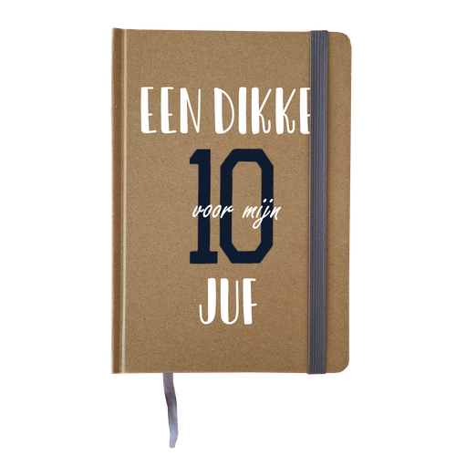 Het notitieboekje heeft een bruine kleur, en bevat een grijze band (met grijs lint). De kleur van de opdruk kan je zelf bepalen. De tekst kan in twee kleuren, namelijk zwart en wit, en de 10 kan in wel 32 verschillende kleuren!