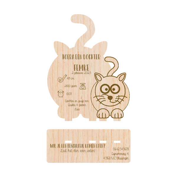Ben je in verwachting en ben je nog opzoek naar een orginieel geboortekaartje? Het diertje kan in het steuntje worden geplaatst zodat het een 3D-kaartje wordt. Deze kaartjes zijn gemaakt van 3mm dik berken triplex en passen in een standaard envelop.