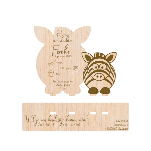 Ben je in verwachting en ben je nog opzoek naar een orginieel geboortekaartje? Het diertje kan in het steuntje worden geplaatst zodat het een 3D-kaartje wordt. Deze kaartjes zijn gemaakt van 3mm dik berken triplex en passen in een standaard envelop.